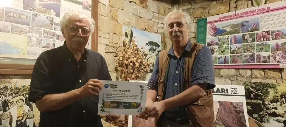Yapılan sunumdan sonra konukların sorularını yanıtlayan Ali Vardar’a, arkeolog Levent Vardar tarafından EKODOSD’un teşekkür belgesi takdim edildi.