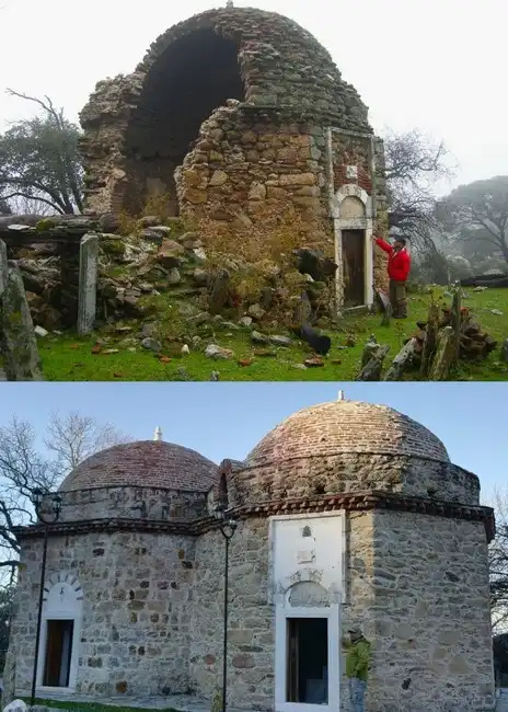 Rotamızın üzerindeki, Horasan erenleri tarafından kurulan Eski (İkiz) Türbe köyüne gittik.16 yıl önce geldiğimizde İkiz türbelerden birinin tamamen yıkılmış, diğer türbenin duvarının bir bölümünün bir menengiç ağacının devrilmesiyle birlikte yıkıldığını görmüştük.Kitabesine göre 1025 yılında yapıldığı bilinen Türbelerin restore edilmiş hallerini, değişen camisini, yağlık ve medresenin bulunduğu tarihi yapıları gezdik.