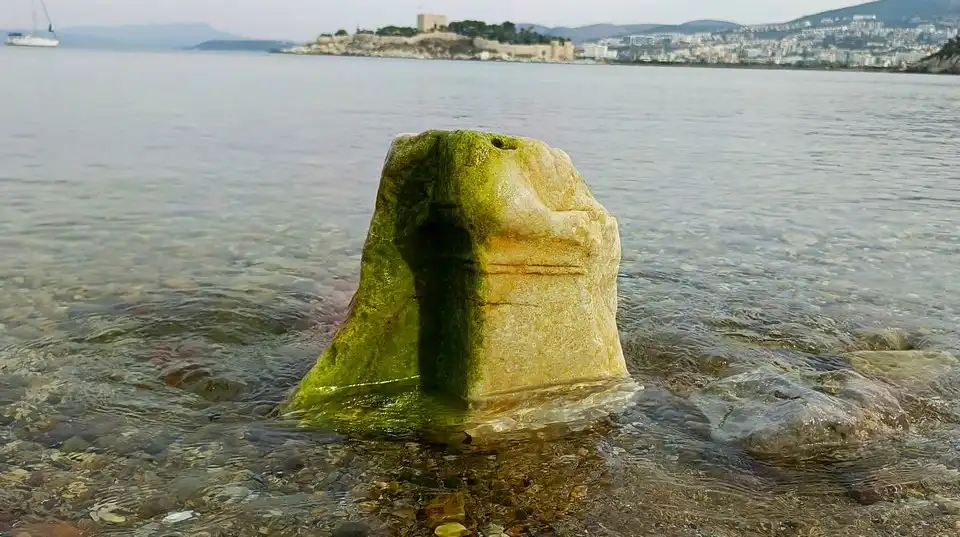 Kuşadası’nın önemli arkeolojik alanlarından biri olan Yılancıburnu’nda, önceki yıllarda yapılan kurtarma kazısı haricinde bugüne kadar sistemli bir kazı çalışması yapılmamıştır. Yeni bulunan taşın mermer malzemeden üzerine sütun gelecek şekilde yapılmış Roma İmparatorluk Dönemi’ne ait olduğu tahmin edilmektedir.