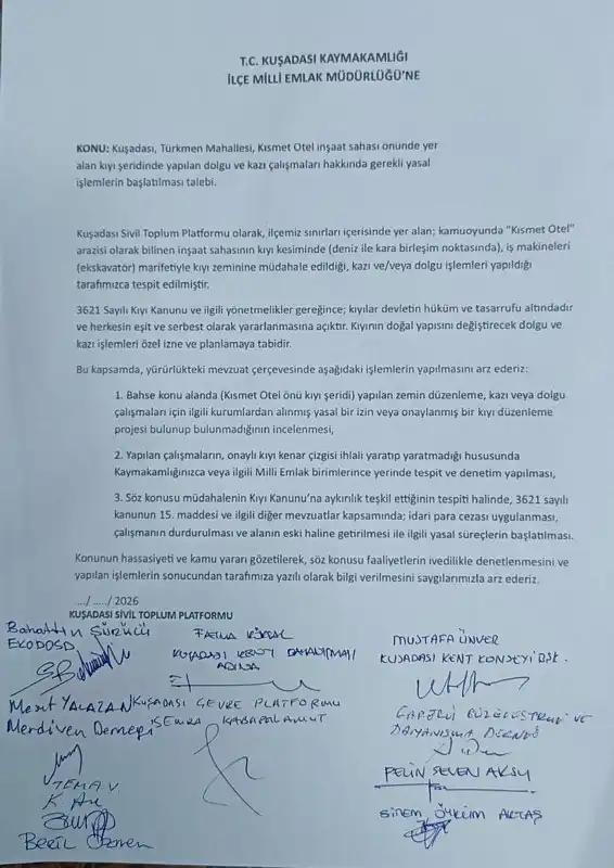 Kuşadası Sivil Toplum Platformu olarak, Kısmet Otel’in inşaat sahası önündeki kıyı şeridinde iş makineleriyle kıyı zeminine yapılan çalışmalar sonucunda alanda oluşan tahribatlarla ilgili gereğinin yapılması için Kuşadası Milli Emlak Müdürlüğü’ne başvuru yapıldı.