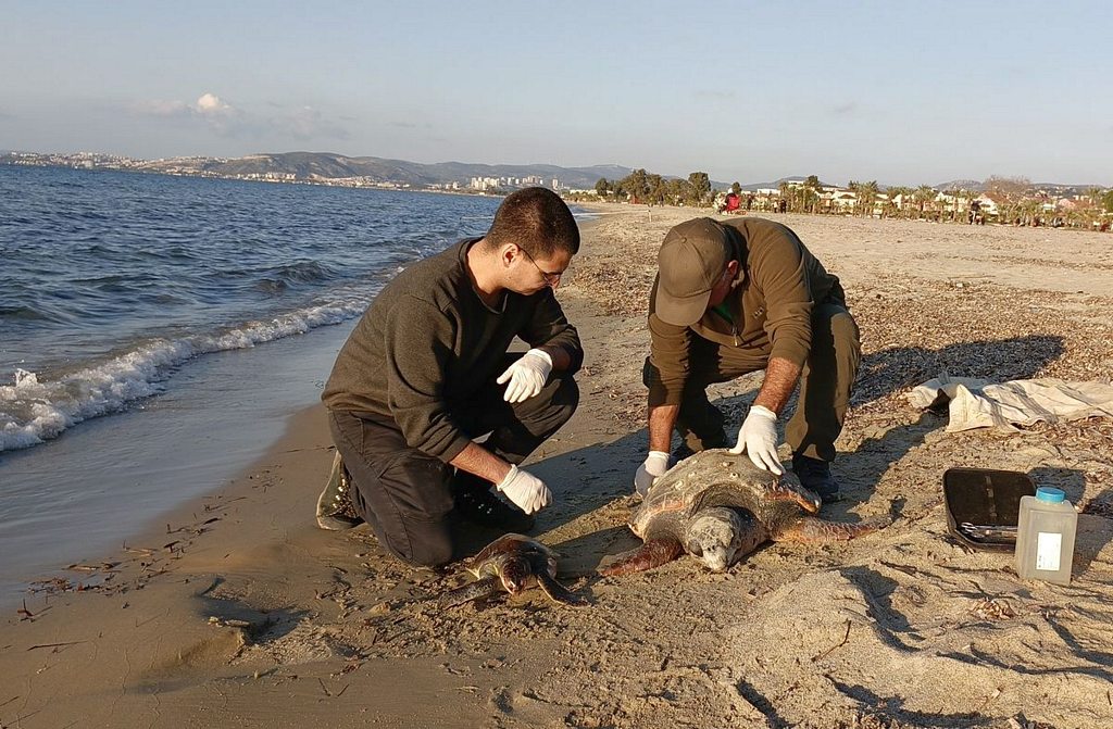 Kuşadası sahillerinde birbirine yakın iki alanda 2 adet deniz kaplumbağasının kıyıya vurduğu ihbarı geldi. Yapılan incelemelerde birinin Chelonia mydas türü juvenil bir Yeşil deniz Kaplumbağası olduğu, diğerinin de C.caretta İribaş Deniz Kaplumbağası olduğu tespit edildi. C.carettanın arka üyelerinde tespit edilen ağ parçalarından ağlara takıldığı, C.Mydas’ın da muhtemelen trol ağlarına hedef dışı av olarak yakalandığı ve su yüzeyine nefes almak için çıkamadığından her ikisinin de boğularak öldüğünü düşünmekteyiz.