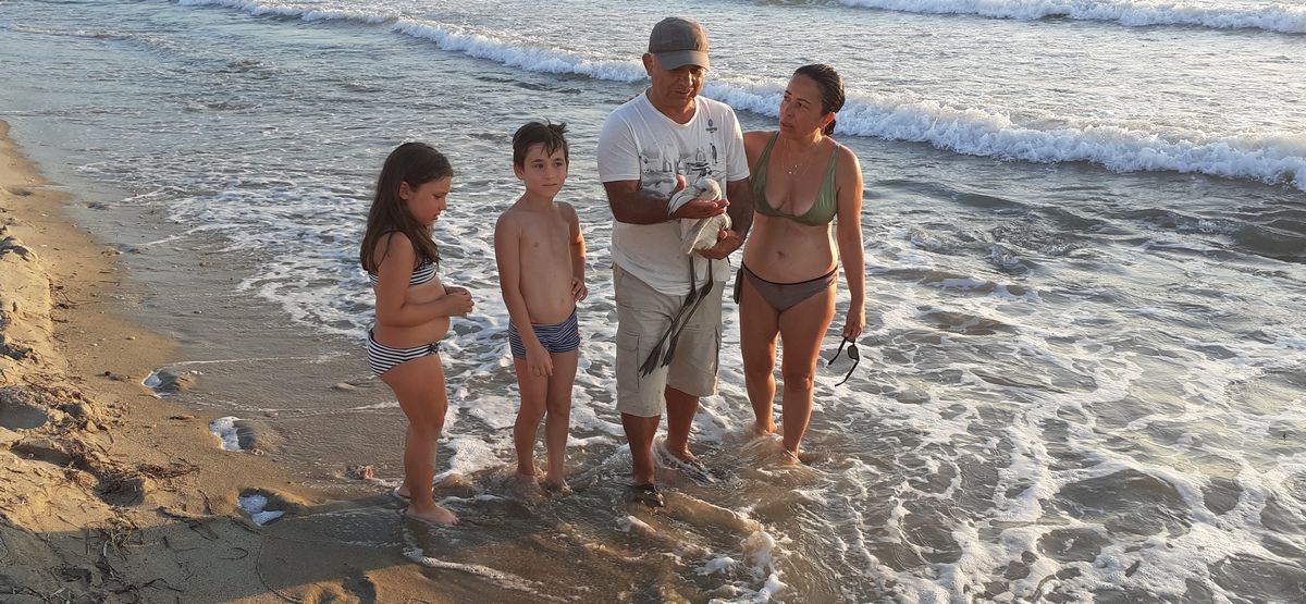 İzmir Kuş Cennetinden yola çıkıp, Büyük Menderes Deltası’na doğru giden Juvenil bir flamingo (Phoenicopterus roseus), Dilek Yarımadası’nı geçemeyince, geri dönüp Kuşadası Kadı Kalesi Nazilli Sitesi plajına zorunlu iniş yaptı. İtalya’da yaşayan ve tatilini Nazilli Sitesinde geçiren Emel SERİO EKODOSD’u arayarak, bir flamingonun plaja indiğini, herhangi bir sorunu olabileceği konusunda bilgi verdi. Biz gelinceye kadar da plajda oynayan küçük Ateş NAZLI flamingoyla aralarında bir bağ kurmuş, onunla ilgilenmiş ve birlikte gezinmişler.