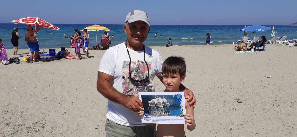Bir flamingonun ilk kez vatandaşların olduğu bir plaja indiğini gördük. Kontrol altına alınan ve bakımı yapılan flamingo sağlıklı bir şekilde tekrar doğal yaşam alanına bırakıldı. Küçük Ateş NAZLI’nın da, belki de hayatında hiç unutamayacağı bir anısı oldu. Onun gelecekteki yaşamında önemli yer edecek anısı sayesinde kuşlara ve doğaya daha farklı bakacak. Ateş NAZLI’nın, gelecekte kendisi gibi birçok doğaseverin yetişmesini sağlayacağını umuyoruz. Flamingonun anısına küçük Ateş’e EKODOSD’un teşekkür belgesini takdim ettik.