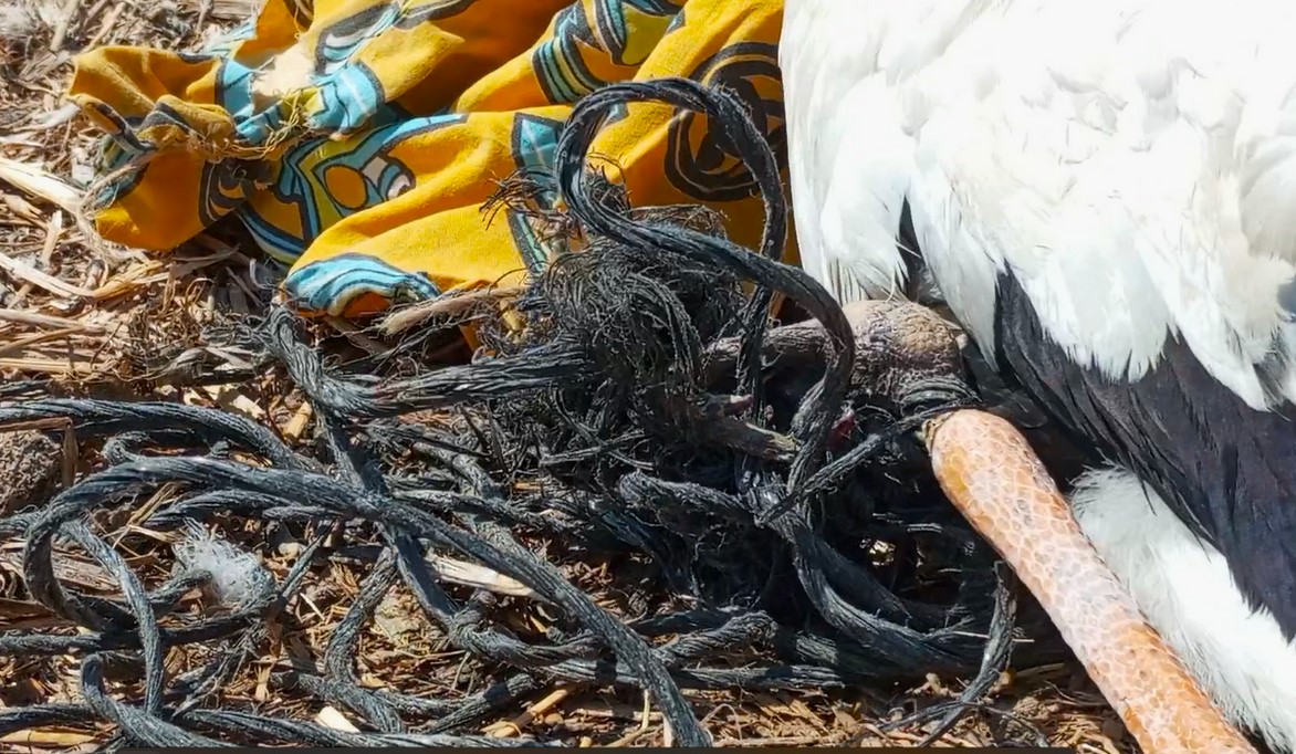 BOM aracıyla yuvaya çıktığımızda, yavrunun sol bacağına dolanan siyah plastik saman iplerinin, bacağı sıka sıka neredeyse koparacak hale getirmiş olduğunu ve ayağının tamamen işlevsiz hale geldiğini gördük.