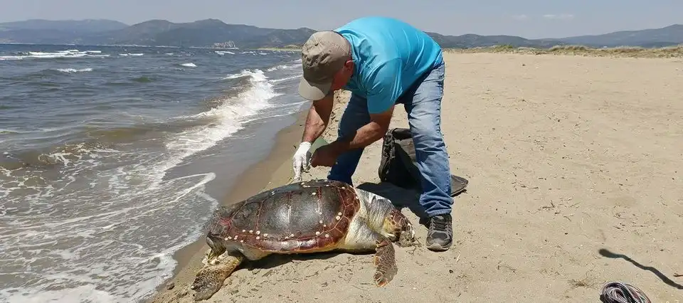 Pamucak plajında kıyıya vuran kaplumbağanın Caretta caretta İribaş Deniz Kaplumbağası olduğu tespit edildi. Yapılan kontrollerde kaplumbağanın kafa kısmına bir darbe alarak öldüğü belirlendi. Muhtemelen su yüzeyine nefes almak için çıkan kaplumbağanın bir deniz aracı tarafından çarpıldığını düşünüyoruz. Bu mevsimde C.carettalar çiftleşmek için kıyılara gelmekte, turizm mevsimi de başladığından deniz trafiği de yoğunlaşmaktadır.